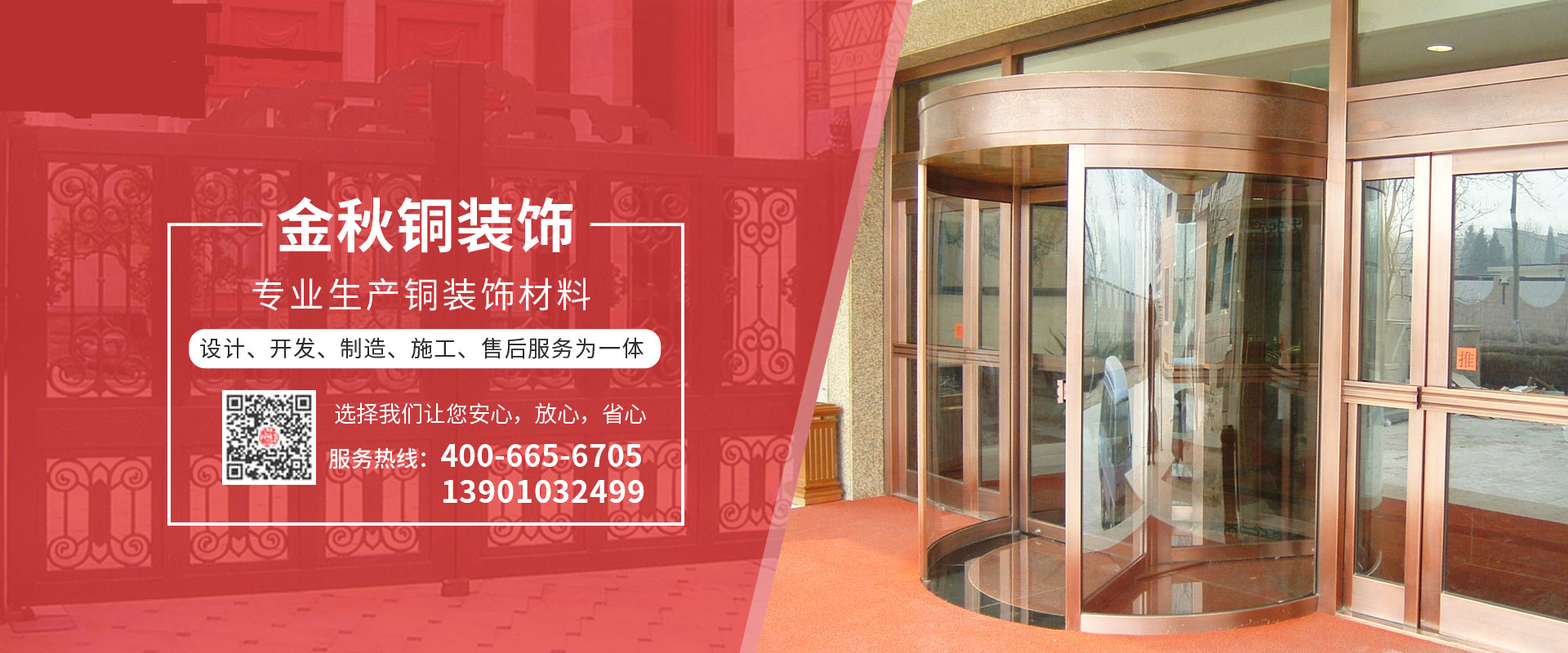 北京金秋銅裝飾材料有限公司是專業(yè)生產(chǎn)銅裝飾材料及設計、開發(fā)、制造、施工、售后服務為一體的大型綜合企業(yè)??沙薪咏ㄖ~裝飾工程及五星級酒店、別墅、博物館、樓樘管所等高檔銅裝飾項目;生產(chǎn)各種規(guī)格的旋轉門、平滑門、別墅門、電控門、工藝門、旋轉護欄、屋頂銅飾防水瓦、浮雕壁畫......